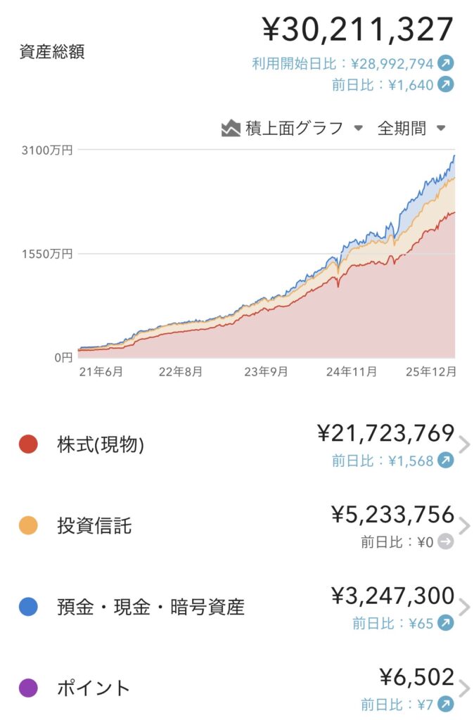 2025年12月27日時点の金融資産は、国内株・米国株合計で約3,000万円です。会社員としての給与をベースに、入金力と配当再投資を武器にここまで積み上げてきました。