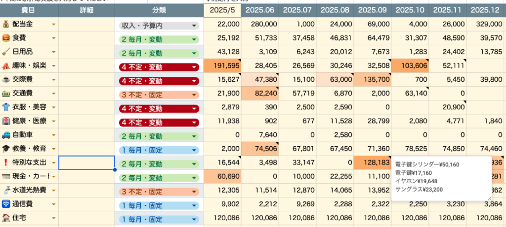 マネーフォワードで出た項目の推移を見るために表を作成しています。