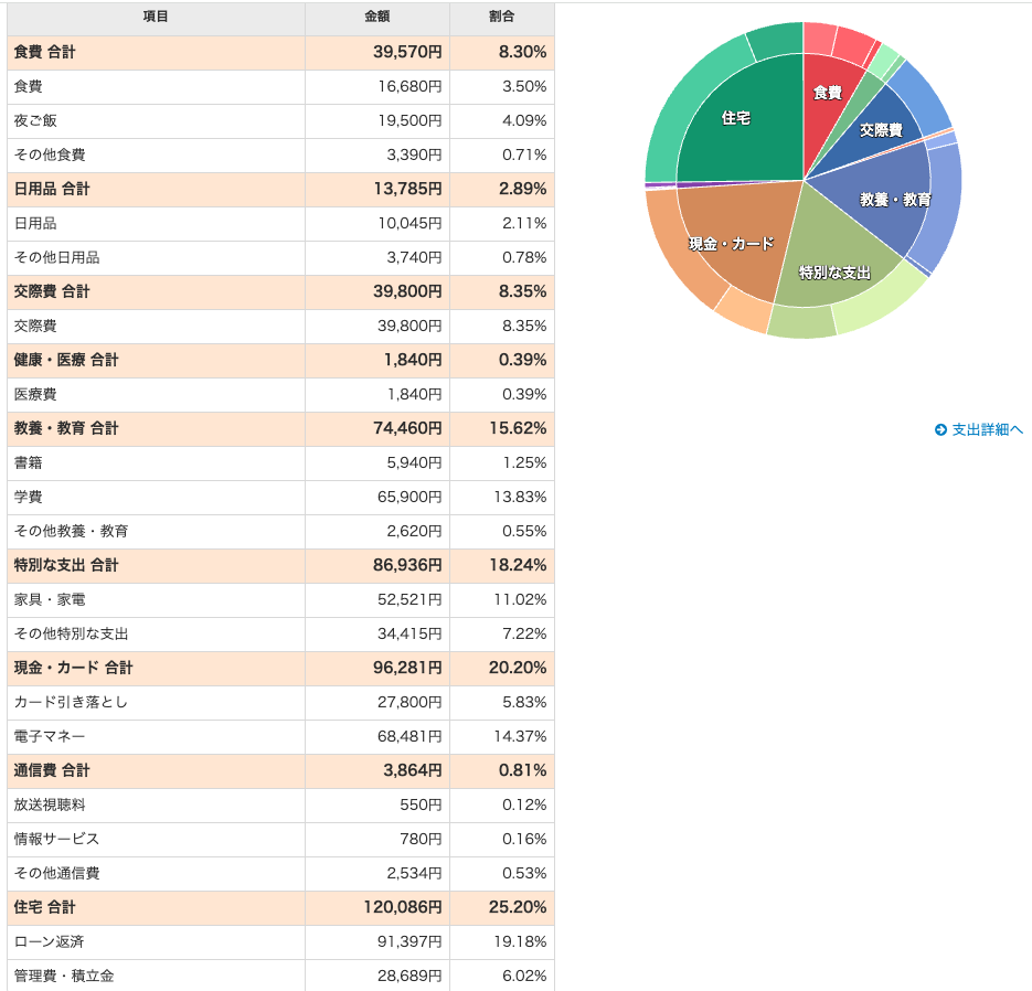 マネーフォワードで連携すると以下のように月毎で項目と支出が自動で出てきます。